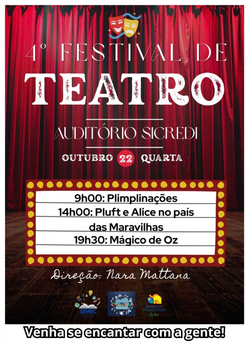 O município de Palotina realiza nesta quarta-feira (22) o 4º Festival de Teatro, evento que promete encantar o público com apresentações repletas de criatividade, cultura e emoção. O festival acontece no Auditório Sicredi e é uma realização da Secretaria Municipal de Educação e Cultura (SEMEC), com direção de Nara Mattana.