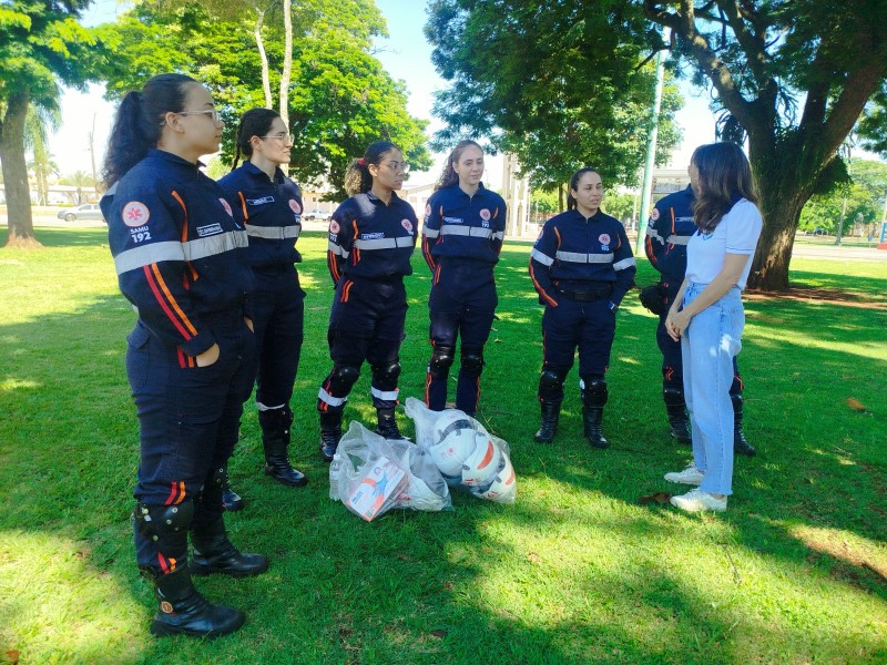 O treinamento está sendo realizado na Praça Amadeo Piovesan e tem como objetivo aprimorar as técnicas de atendimento em ocorrências de emergência, especialmente em situações de acidentes com vítimas presas às ferragens.
