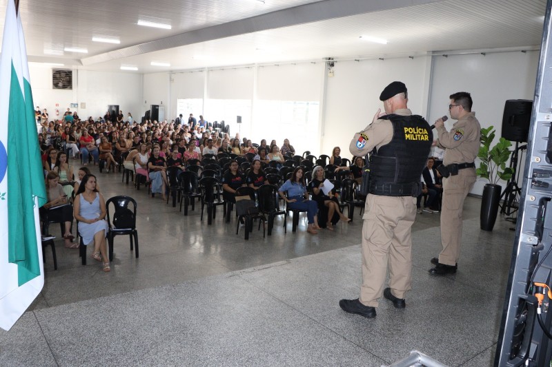 Durante a abertura da Semana Pedagógica, na manhã desta quarta-feira (28), o cabo Everton Duim Ruffato e o sargento Cantelli, da Polícia Militar de Palotina, abordaram a importância dos cuidados no uso de veículos autopropelidos, reforçando ações educativas e preventivas junto à comunidade escolar.